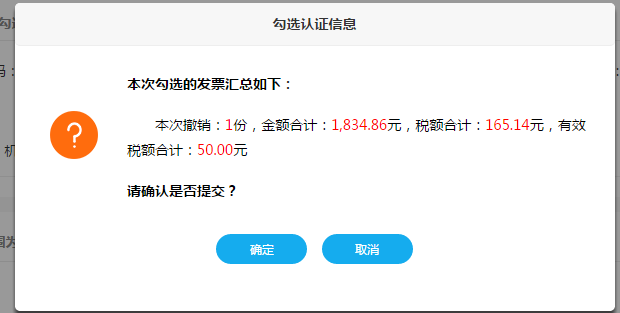 确认本次需要勾选的发票全部撤销勾选完成后,点击“提交”按钮,弹出撤销勾选信息对话框如下: