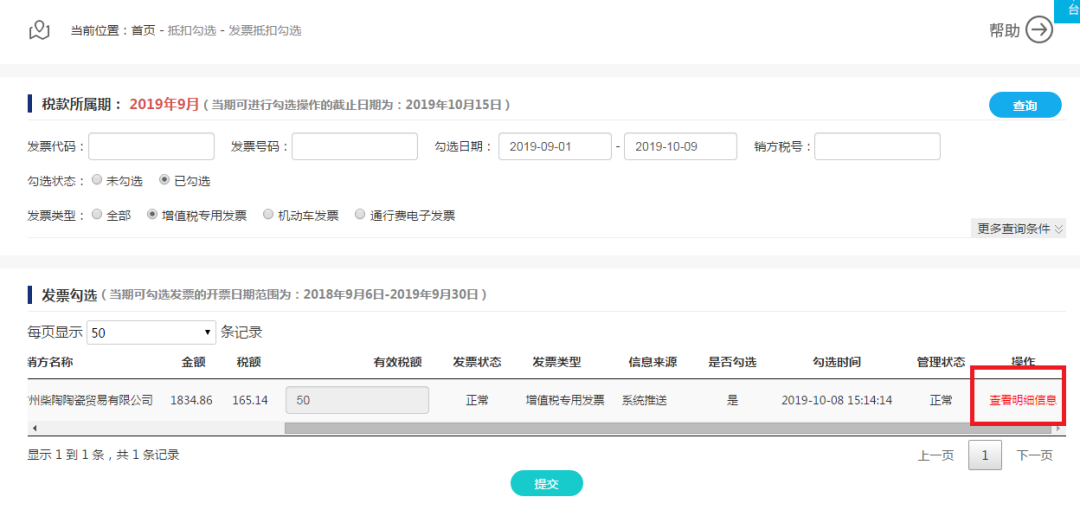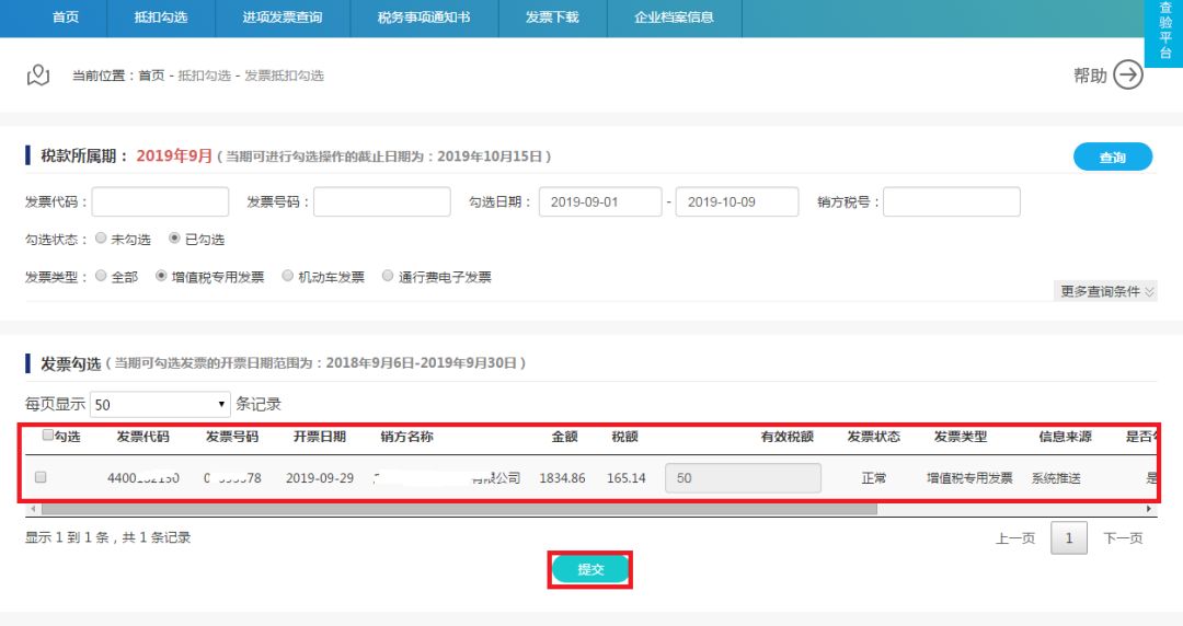 对查询出的已勾选发票,选中一张勾选标志为“已勾选”的发票,可取消第一列的勾选状态,实现对前次勾选操作的撤销处理(处理完成该发票,该发票就转变为未勾选状态)。