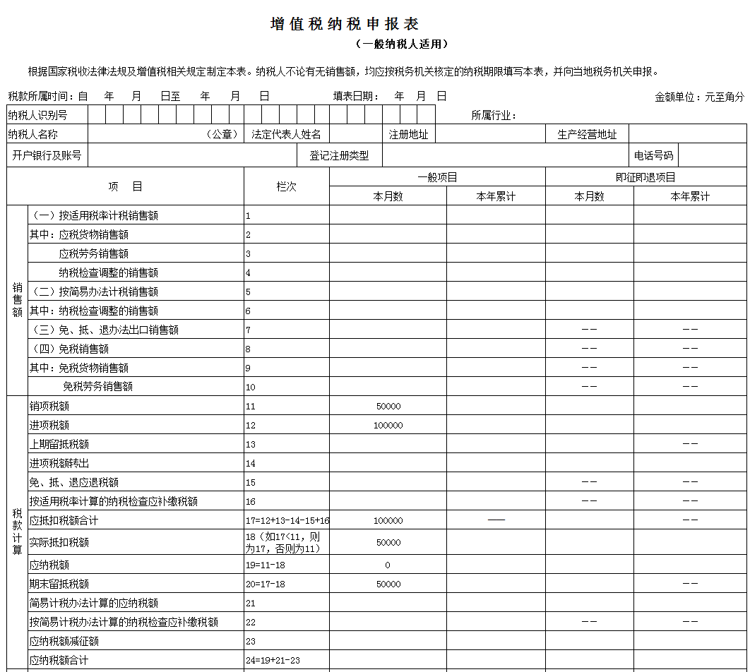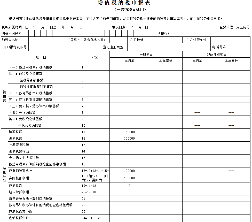本栏“一般项目”列“本月数”=第11栏“销项税额”“一般项目”列“本月数”-第18栏“实际抵扣税额”“一般项目”列“本月数”-“实际抵减额”;本栏“即征即退项目”列“本月数”=第11栏“销项税额”“即征即退项目”列“本月数”-第18栏“实际抵扣税额”“即征即退项目”列“本月数”-“实际抵减额”。该企业2019年10月应纳税额=本期销项税额-本期进项税额-本期实际抵减税额=150000-100000-50000=0(元)该企业2019年10月(税款所属期)主表填报如下所示: