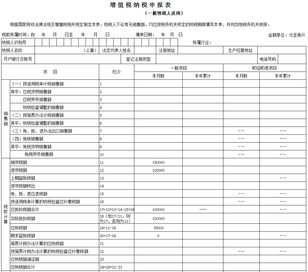 本栏“一般项目”列“本月数”=第11栏“销项税额”“一般项目”列“本月数”-第18栏“实际抵扣税额”“一般项目”列“本月数”-“实际抵减额”;本栏“即征即退项目”列“本月数”=第11栏“销项税额”“即征即退项目”列“本月数”-第18栏“实际抵扣税额”“即征即退项目”列“本月数”-“实际抵减额”。该企业2019年10月应纳税额=本期销项税额-本期进项税额-本期实际抵减税额=150000-100000-15000=35000(元)该企业2019年10月(税款所属期)主表填报如下所示: