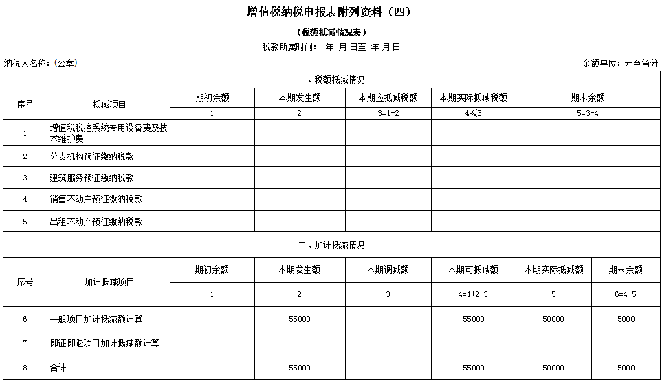 (1)按照39号公告相关规定,纳税人可计提但未计提的加计抵减额,可在确定适用加计抵减政策当期一并计提。企业2019年10月可计提加计抵减额=100000*15%+400000*10%=55000(元)本期销项税额-本期进项税额=150000-100000=50000(元)因此,本期加计抵减实际抵减额为50000元,剩余5000元为期末余额,留待下期抵减。该企业2019年10月(税款所属期)《附列资料(四)》填报如下所示: