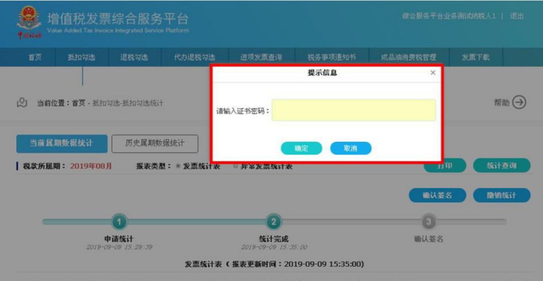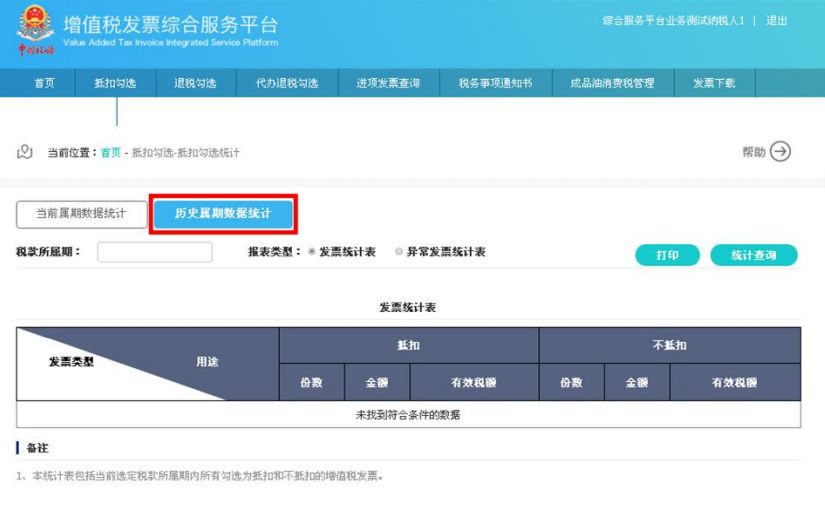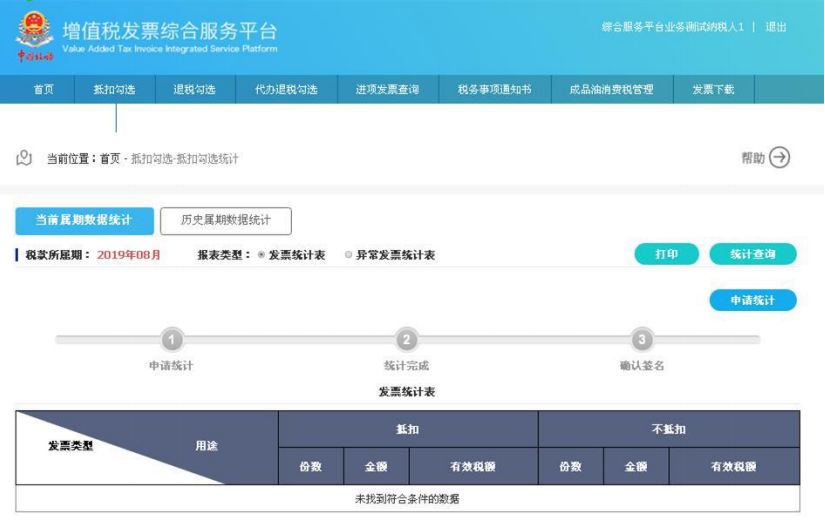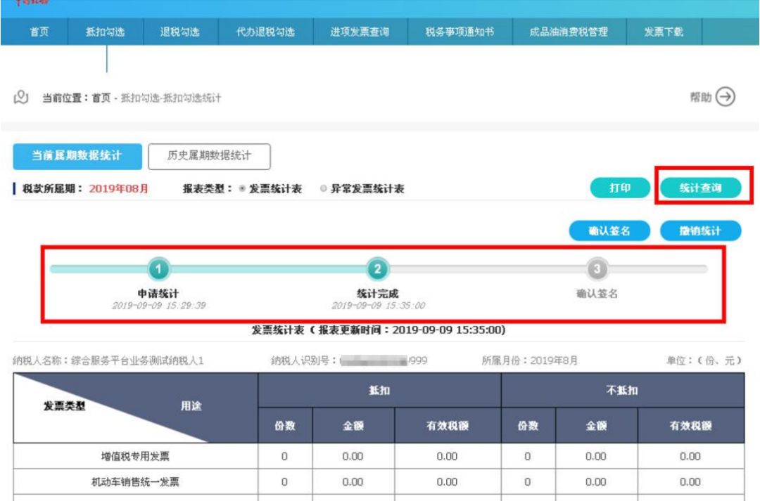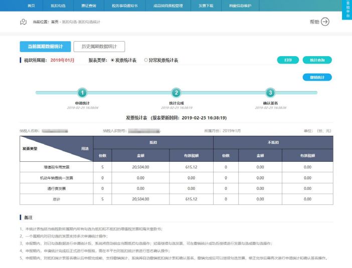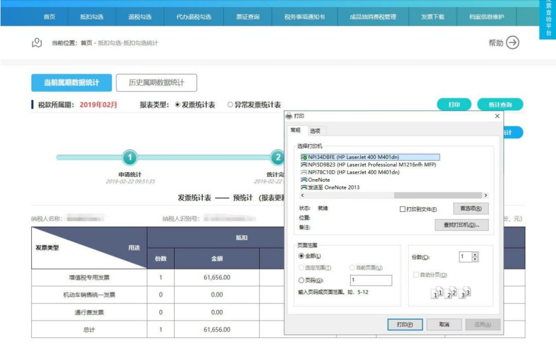 用户可以通过点击申报抵扣发票统计表右上方的“打印”按钮,连接本地打印机对统计表进行打印操作。  第九步