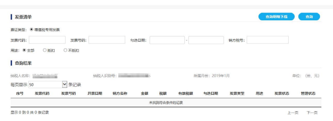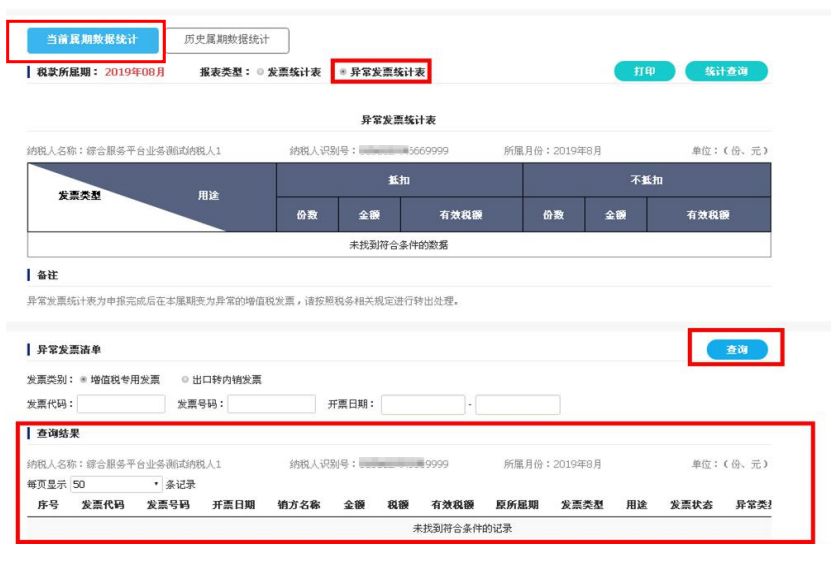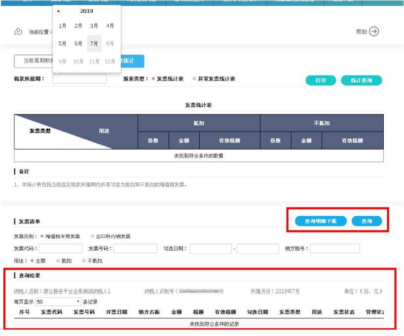 勾选明细查询及导出:签名确认成功后,可对本期的认证数据进行查询和导出。选择“当前属期数据统计”,报表类型选择“异常发票统计表”,系统返回当前属期的异常发票统计表。页面下方展示的异常发票清单(如图所示)选择某一历史属期,就可显示该期的发票统计表或异常发票统计表,并可进行明细数据查询和下载,如下图所示。1.  纳税人登录增值税发票综合服务平台(企业版)后没有抵扣勾选功能是什么原因?答:请确认纳税人是否为小规模纳税人或转登记纳税人,或一般纳税人未到生效日期。2. 通过大厅扫描认证过的发票是否需要在综合服务平台上勾选确认?答:需要。在此特别提示:若纳税申报时无法自动获取进项数据,请自行核实综合服务平台是否已经完成抵扣确认流程(勾选、统计、确认签名);此时,请不要通过大厅强制保存进行申报,若强制保存并缴款成功后将无法调整申报的进项数据。3.  增值税发票综合服务平台(企业版)抵扣勾选模块都有哪些功能?答: 抵扣勾选模块包含发票抵扣勾选、发票批量抵扣勾选、发票不抵扣勾选、逾期发票抵扣勾选、出口转内销发票勾选以及抵扣统计确认等功能。4. “ 发票抵扣勾选” 模块可以勾选的发票数据有哪些?(1)由增值税发票管理新系统开具且尚未完成认证的增值税专用发票(代办退税专用发票除外)、机动车销售统一发票、增值税电子普通发票(通行费)。5. “ 发票抵扣勾选” 模块不可勾选的发票数据有哪些?答 :不可勾选的发票数据有:超过抵扣时限的发票且未经税局审核通过的发票(逾期发票);已作废、已红冲、已失控、管理状态非正常等异常发票。6.  纳税人取得增值税电子普通发票(通行费)或者机动车销售统一发票,但是抵扣勾选中找不到对应发票信息?答:(1)抵扣勾选模块发票类型默认为“增值税专用发票”,纳税人可以在发票勾选页面将发票类型选择为“全部”进行查询。(2)超过抵扣时限的发票且未经税局审核通过的发票(逾期发票);已作废、已红冲、已失控、管理状态非正常等异常发票是不可以勾选的,请核实发票状态。7.  抵扣联发票扫描认证后在综服平台中勾选状态仍为未勾选 ?答:(1)取得进项发票时,一般会在销方开具发票之后先将存根联信息经过电子底账同步到综服平台当中,如果在这之后进行扫描认证,发票当天状态仍显示为未勾选状态,一般会在第二天变为已勾选状态;(2)取得进项发票时,如在综服平台接收到存根联信息之前进行扫描认证,综服平台则会先获取该抵扣联信息,发票状态在扫描认证之后就变为已勾选状态。8.  纳税人是否可以修改有效税额,且将剩余进项税额留到下期抵扣?答:不可以,有效税额若小于实际税额,差额部分则视为自动放弃抵扣,且以后属期均不可再进行抵扣。答:不抵扣勾选模块只有当纳税人自愿完全放弃该发票对应进项税额抵扣的权益时可进行该操作。10. 勾选为“ 部分抵扣” 和“ 不抵扣” 的发票,该所属期申报缴税后能否再次选择抵扣?11.  对于发票抵扣量大的企业可以实现批量勾选发票么?答:发票抵扣量大的企业,可以使用“发票批量勾选”模块,通过文件导入的形式实现批量勾选,提高发票勾选效率、降低勾选工作量。12.  可以将同一份发票同时进行“ 抵扣勾选” 和“ 退税勾选” 吗?13.  纳税人如何对当期申请抵扣的发票数据进行确认?答:征期内,纳税人完成当期抵扣勾选后,需在增值税申报抵扣前,到“抵扣勾选统计”模块申请统计,生成本期可用于申报抵扣的发票汇总统计表,并进行“确认签名”。14.  作废(红冲)等异常发票自动撤销勾选是什么原因?答:(1)如果在综服平台已经接收到进项发票信息之后(未勾选),操作作废(红冲)或其他异常状态,第二天会接收到发票状态变更信息,已经作废(红冲)或其他异常状态的发票则不可勾选。(2)如果在综服平台已经接收到进项发票信息之后(已勾选),操作作废(红冲)或其他异常状态,第二天会接收到发票状态变更信息,同时系统自动撤销勾选。(3)如果在综服平台还未接收到作废(红冲)或其他异常状态信息,操作作废(红冲)或其他异常状态,则接收到的发票状态即为作废(红冲)或其他异常状态,发票将不能进行勾选操作。