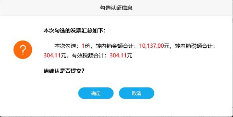 用户根据查询结果选择发票进行不抵扣勾选操作,确认本次需要勾选的发票全部勾选完成后,可以点击“提交”按钮,弹出勾选确认信息对话框如下:勾选状态选择“已勾选”,点击查询,可查询到已经勾选的出口转内销发票信息,如下显示:在查询出的已勾选发票中,取消发票信息前面的“√”勾选标志,显示如下:(2)当前税款所属期可用于申报抵扣的发票汇总统计表及异常发票统计表;(3)历史税款所属期发票统计表及异常发票统计表。