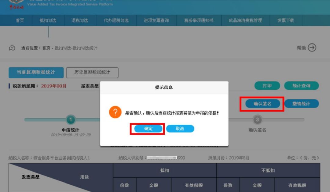 统计完成后,需对统计表进行签名确认,方可进行当期的抵扣申报工作,点击“确认签名”按钮后,系统会弹出提示信息对话框,“是否确认,确认后当前统计报表将作为申报的依据”,点击提示信息对话框中“确定”按钮。  第六步
