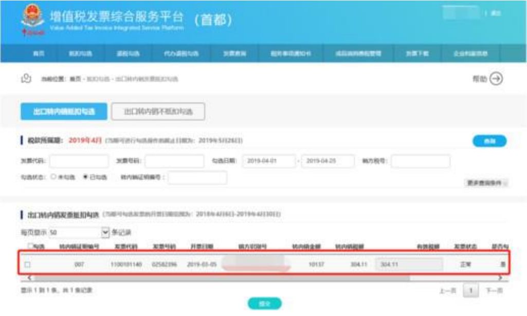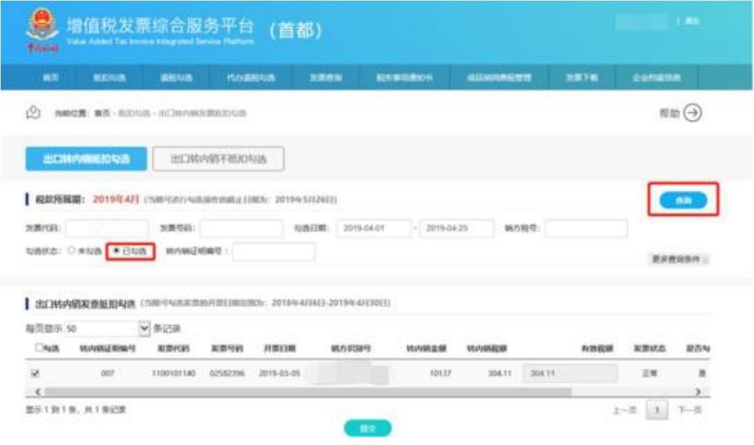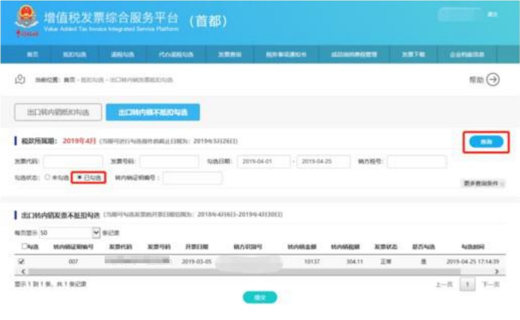 用户根据查询结果选择发票进行抵扣勾选操作,确认本次需要勾选的发票全部勾选完成后,可以点击“提交”按钮,弹出勾选确认信息对话框如下:勾选状态选择“已勾选”,点击查询,可查询到已经勾选的出口转内销发票信息,如下显示:在查询出的已勾选发票中,取消发票信息前面的“√”勾选标志,显示如下:第一步