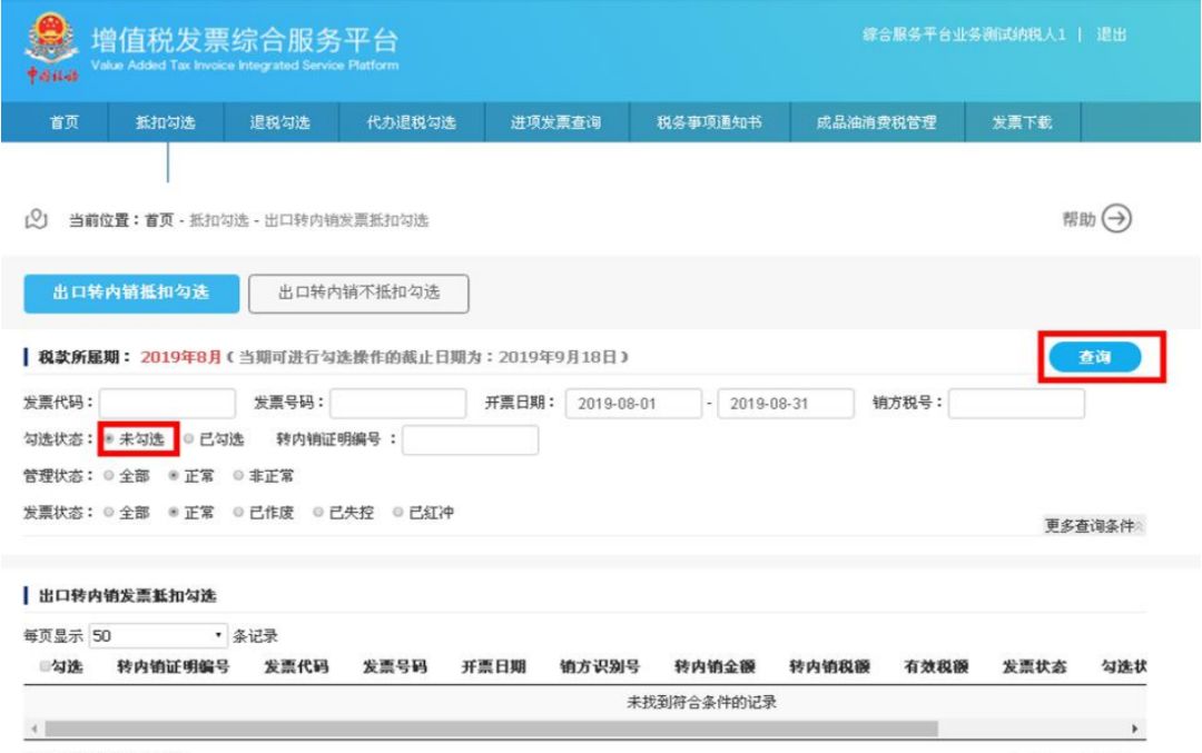 勾选状态选择“未勾选”,根据需要输入或选择相关查询条件,然后点击“查询”按钮,则在勾选操作区显示符合查询条件的发票:第二步