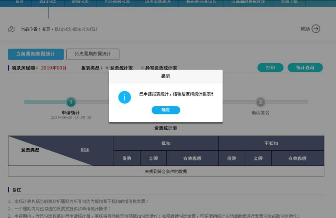 如果当前税款属期还未生成统计报表,您可点击“申请统计”按钮进行统计。系统提示,已申请报表统计,请稍后查询统计报表。在申报期内点击“申请统计”后,系统将锁定当期抵扣勾选操作,如需继续勾选,可点击“撤销统计” 按钮,撤销成功后系统将自动解锁当期抵扣勾选操作。  第二步