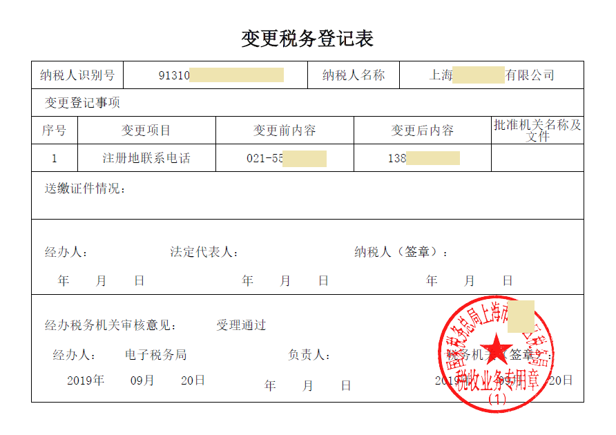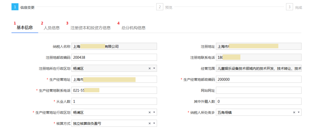 一、办理条件 纳税人工商登记信息发生变更(除生产经营地、财务负责人、核算方式等信息外),向工商机关办理变更登记,工商机关核准后将变更信息即时共享至信息交换平台。 纳税人上门(或电子税务局)申请后,税务机关根据工商传递的变更信息和纳税人填报的变更信息,更新税务系统内纳税人对应信息;对非工商变更信息,如生产经营地、核算方式等信息,发生变化时,向税务主管机关申请变更。 二、电子税务局可变更项目 根据工商传递的变更登记信息可办理变更的项目包含: (1) 纳税人名称; (2) 注册地址、注册地邮政编码、注册地联系电话、注册地所在行政区划; (3) 经营范围; (4) 法定代表人(负责人)姓名、法定代表人(负责人)身份证件种类、法定代表人(负责人)身份证件号码。 可自行申请变更的项目包含: (1) 法定代表人(负责人)固定电话、法定代表人(负责人)移动电话、法定代表人(负责人)电子邮箱; (2) 财务负责人姓名、财务负责人身份证件种类、财务负责人身份证件号码、财务负责人固定电话、财务负责人移动电话、财务负责人电子邮箱; (3) 生产经营地址行政区划、生产经营地址、生产经营地邮政编码、生产经营地联系电话、纳税人所处街乡、网站网址; (4) 从业人数、从业人数(其中:外籍人数)、核算方式; (5) 注册资本币种、注册资本金额、投资总额币种、投资总额金额、投资方名称、投资方证件类型、投资方证件号码、投资方经济性质、投资方投资比例(%)、投资方国籍(地区)、投资方地址、投资方投资金额(万元)、投资方有效期起、投资方有效期止; (6) 总分机构类型、总机构相关信息、分支机构相关信息。 三、操作指引 1. 登录电子税务局,点击“我要办税”-“综合信息报告”。 2. 点击“一照一码户信息变更”。 3. 可变更项目分为 “基本信息”、“人员信息”、“注册资本和投资方信息”和“总分机构信息”,选择需要变更的项目继续办理。 4. 填写完毕后,选择“经办人”(注意:经办人为系统自动调用已经完成实名认证的人员姓名,可以通过下拉框进行选择。未完成实名认证的经办人,请先至“办税人员实名信息采集”模块完成实名认证),点击“下一步”。 5. 核对需要变更的项目,确认无误后点击“提交”。     6. 纳税人声明,点击“确定”。 7. 提交成功,受理通过。点击“下载打印文书表单”,可查看此次事项申请的详细信息。 1. 此业务无需上传附列资料,纳税人申请即时办结。 2. 纳税人名称、注册地址、注册地联系电话、注册地所在行政区划、经营范围、法定代表人(负责人)姓名、法定代表人(负责人)身份证件种类等信息将直接调用工商税务信息交换平台中的信息,纳税人确认后即可完成变更,不能手工进行修改。 3. 纳税人因经营场所跨区迁移且已办理住所变更登记而需要变更主管税务机关的,应通过“跨区迁移企业税务事项报告”模块进行办理。 4. 纳税人投资方信息变更,先输入原投资方信息中的“有效期止”,再增行录入新投资方相关信息。如需修改历史投资方信息(如历史投资方名称、证件类型、证件号码等),请至办税服务厅进行修改。