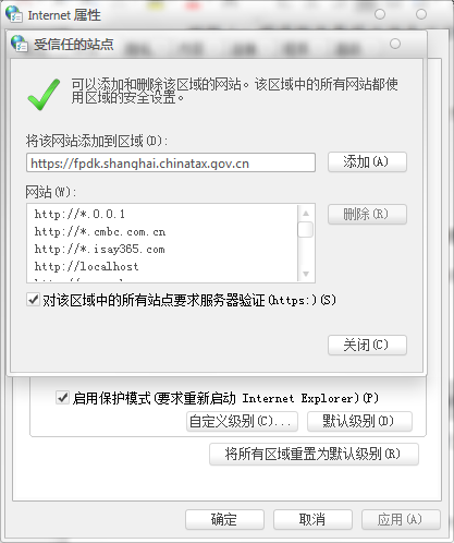 1.在浏览器中,把本平台的地址(https://fpdk.shanghai.chinatax.gov.cn)加入可信站点,并在可信站点的“自定义级别”-“设置”中,将全部选项启用,重启浏览器生效;