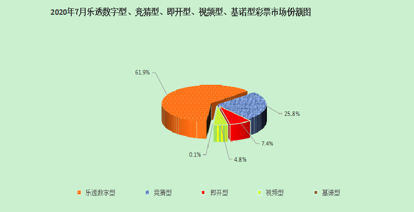 7月份,乐透数字型彩票销售224.22亿元,同比增加33.06亿元,增长17.3%;竞猜型彩票销售93.10亿元,同比增加11.22亿元,增长13.7%;即开型彩票销售26.74亿元,同比增加4.68亿元,增长21.2%;视频型彩票销售17.29亿元,同比减少14.79亿元,下降46.1%;基诺型彩票销售0.13亿元,同比减少0.02亿元,下降14.5%。7月份,乐透数字型、竞猜型、即开型、视频型、基诺型彩票销售量分别占彩票销售总量的61.9%、25.8%、7.4%、4.8%、0.1%。