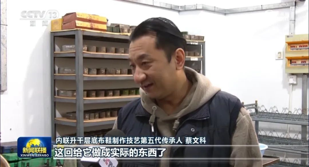 内联升千层底布鞋制作技艺第五代传承人蔡文科:像模具,以前根本就想都没想过,这回给它做成实际的东西了。像我们的分厂,他们已经在用了。比如说100双(鞋底),以前都是三四个人(干),现在一个人一会儿弄出来。